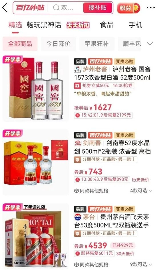 52度国窖1573两瓶1627元,52度剑南春水晶剑两瓶743元,53度散装飞天茅台两瓶4539元……这是拼多多平台中秋节前的名酒价格,而且还有正品险、买贵必赔、假一赔十等标签,相信有名酒购买需求的人都会心动的。