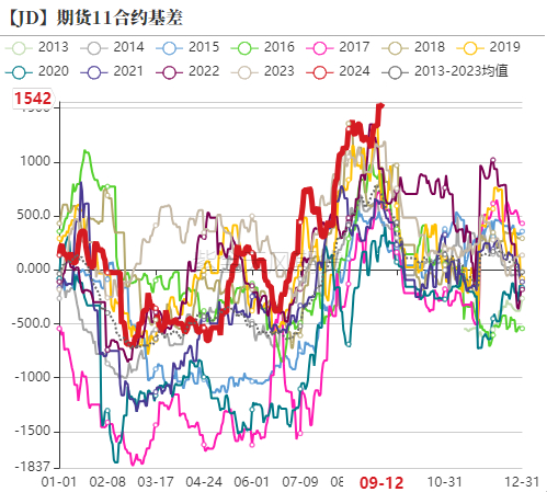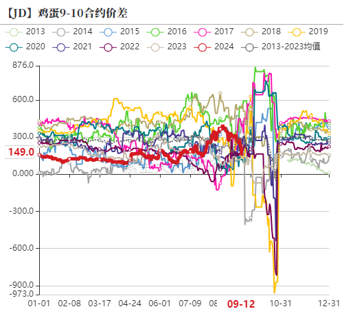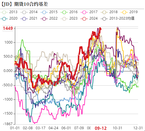 2410合约是国庆节后合约,是需求淡季合约,从近十年的价格规律来看,jd2409与jd2410合约的价差在200左右,截止到9月12日,jd2409与jd2410合约的价差为150左右,也相对合理。中秋节后贸易商短暂补库加上国庆节前补库支撑,预期2410合约掉价幅度不会很大,但因国庆节后需求淡季,加上供应压力逐渐后移,因此国庆节后现货价格掉价幅度会比较大。