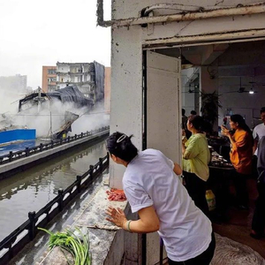 4月23日,康鹭片区F37地块最后一栋大楼倒塌瞬间。图/视觉中国