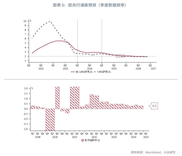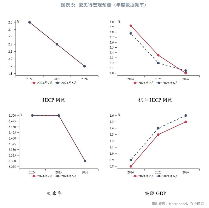 利率前瞻指引没有变化。声明部分对通胀前景保持警惕,认为年内通胀反弹可能性增加;继续强调经济下行风险。最新预测进一步佐证了该观点。欧央行维持总体通胀预测不变,但指出近月服务通胀高于预期,因此上调今明年核心通胀预测;由于经济活动仍然低迷,反映出私人消费和投资疲软,略微下调今明后年增长预测,维持失业率预测不变。在预测模型中,欧央行假设今明后年欧元兑美元中枢分别为1.09、1.10、1.10。