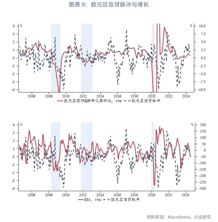 正因如此,宽松给增长回馈的动能相应偏弱。政策利率影响经济活动的渠道有很多,其中私人部门新增贷款是最关键的方面之一。根据Biggs, M.(2010)、Drehmann, M.(2012)等人的研究,我们将欧元区信贷脉冲定义为新增贷款占GDP比重在某一段时间内的变化情况。该指标在历史上危机以外时期与增长环境(如实际GDP、欧元区ESI等指标)的相关性较强。2020年后因疫情、能源冲击和相关政策反应导致被打破的相关性正随着大流行的结束、能源价格正常化逐渐得到修复。在谨慎宽松的情况下,信贷受到的提振亦有限。