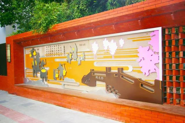 两侧的两个微型文化景观与巨型装饰浮雕相映生辉。九方家园外侧的围墙上,以《华漕古韵》为主题打造的微型文化景观,展示“华漕小锣鼓”“鹤龙桥”“紫隄”等具有华漕历史人文特色的元素。