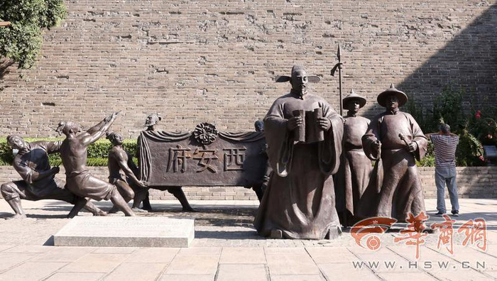 9月9日,西安南门外的几个古人雕塑和“西安府”三个遒劲的大字相得益彰,这也是西安较早的游客打卡点之一。雕塑以古朴的风格展现着长安城的厚重历史,让人仿佛穿越时空,回到那繁华的古都岁月。无独有偶,在南门转盘东南角,一列红色造型的列车前,黄色“长安”特别醒目地立于广场之上,成为地标。