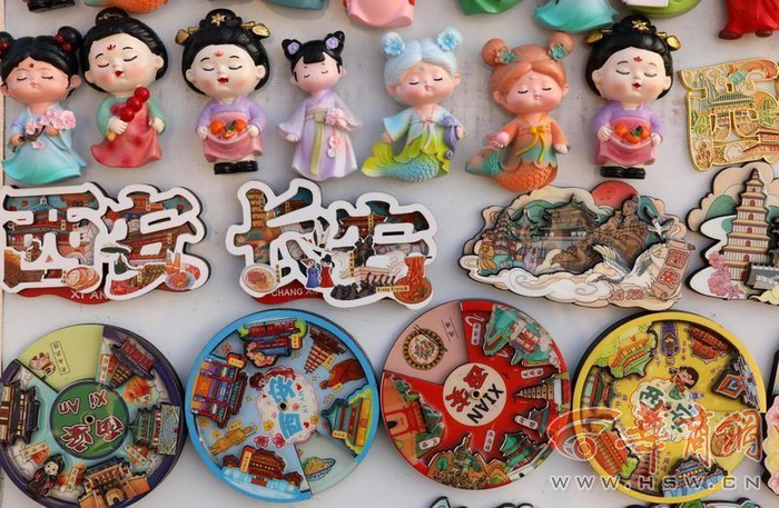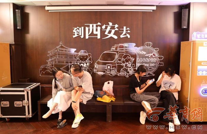 在北院门,一对母子正与远方的亲人视频,她们手上拿的团扇上写着“我在西安,很想你”。这是一份提前预订的独特问候与表达。还有钟楼书店里的“到西安去”独特创意墙,引得不少人坐在下面打卡。
