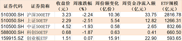 本周市场主要股指集体调整,5只主要指数ETF中,沪深300ETF、上证50ETF跌超2%。