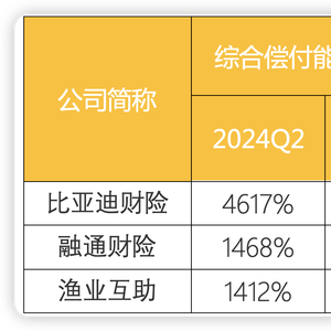 据财联社记者统计,18家险企核心及综合偿付能力充足率均超过500%。其中,开业不久的比亚迪财险、融通财险及渔业互助,其偿付能力充足率依次位列财产险公司前三。