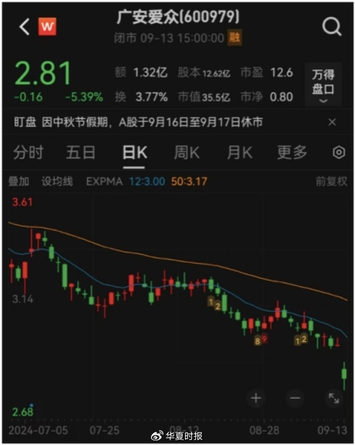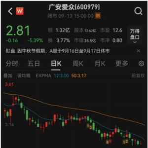 值得一提的是,广安爱众股价长期萎靡不振,目前仍在低位徘徊,由于9月13日受留置消息影响,股价盘中最低触及2.76元,创近半年新低。