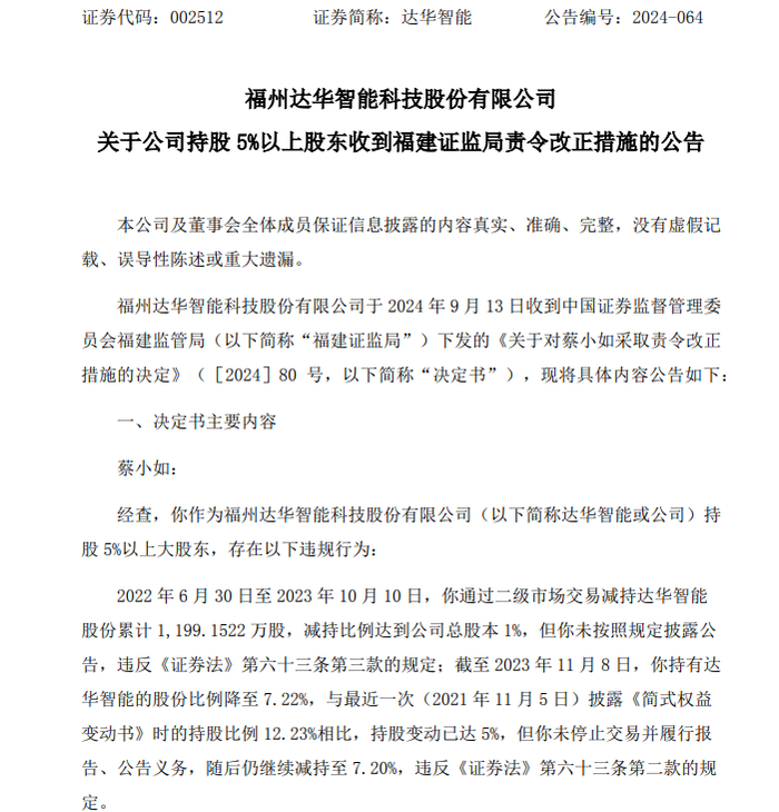 根据达华智能公告,福建证监局认定,蔡小如存在以下违规行为:2022年6月30日至2023年10月10日,通过二级市场交易减持达华智能股份累计1199.15万股,减持比例达到公司总股本1%,但未按照规定披露公告;截至2023年11月8日,持有达华智能的股份比例降至7.22%,与最近一次(2021年11月5日)披露《简式权益变动书》时的持股比例12.23%相比,持股变动已达5%,但未停止交易并履行报告、公告义务,随后仍继续减持至7.20%,违反《证券法》第六十三条第二款的规定。