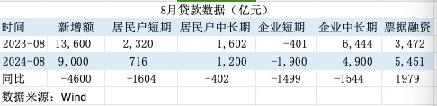 分项来看,8月新增信贷中,票据融资增加5451亿元,占比高达六成。同比来看,8月仅票据融资多增约2000亿元,居民短期贷款、居民中长期贷款、企业短期贷款、企业中长期贷款均同比少增。