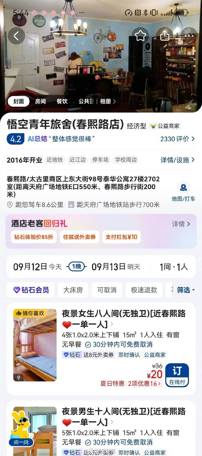 记者在美团、携程等平台上搜索发现,“金泰公寓”“百泰居公寓”“雨恒酒店”“天意客栈”“蓝点公寓”“悟空青年旅舍”等活跃于订房平台,这些“小旅馆”的地址显示均在泰华公寓,有的直接标明了楼栋房号,价格在每晚20—200元,生意火爆,时有满房情况。随机点开“悟空青年旅舍”订房页面,显示位于该小区27层男生10人上下铺床位、女生8人上下铺床位,标价在22—24元不等。