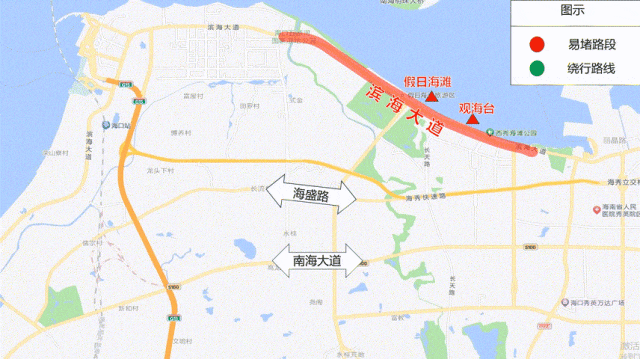 👉如滨海大道假日海滩、观海台路段交通流量大,建议途经车辆绕行快速路、海秀西路-海盛路、南海大道往返。