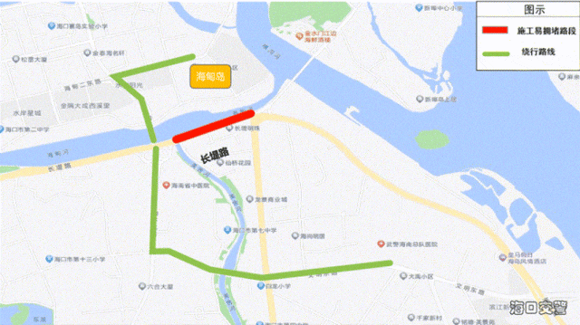 (五)受道路施工影响,长堤路→白沙转盘→新埠岛的车辆可绕行海甸岛,长堤路→白沙转盘→滨江路的车辆绕行文明东路。