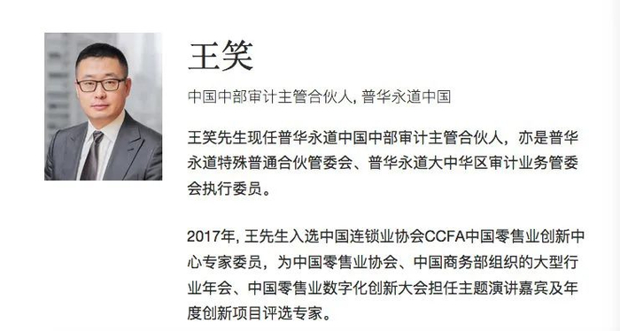 声明中的另一项人事调整是,普华永道中国鉴证业务主管Kevin Wang将担任更重要的职务,领导普华永道中国的审计和鉴证业务。据普华永道中国官网,Kevin Wang的中文名为王笑,目前官网的职务为普华永道中国中部审计主管合伙人,亦是普华永道特殊普通合伙管委会、普华永道大中华区审计业务管委会执行委员。
