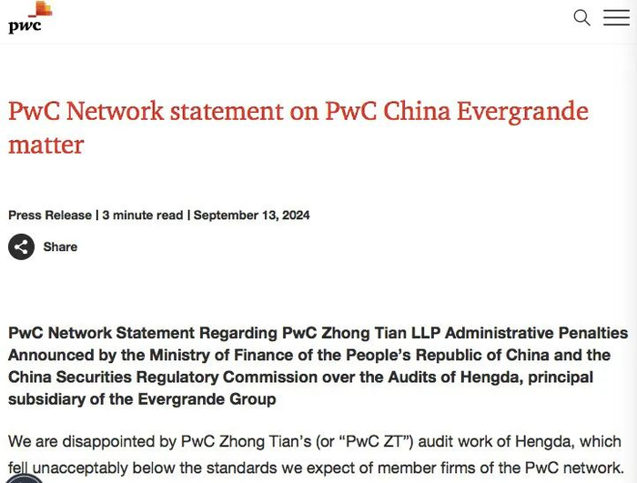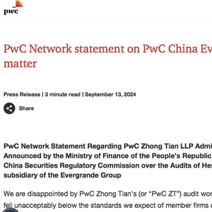 声明中,普华永道全球主席Mohamed Kande在评论此次事件时表示:“普华永道中天恒大地产审计团队所做的工作远低于我们的高预期,完全无法接受。它并不代表我们作为一个网络所代表的立场,普华永道没有这样的空间。因此,在进行彻底调查后,我们确保采取行动追究责任人的责任,并制定全面的补救计划,为未来打造更强大的普华永道中国业务。中国仍然是普华永道网络的重要组成部分,我对普华永道的合作伙伴和员工充满信心,我们将共同努力重建与利益相关者的信任。”
