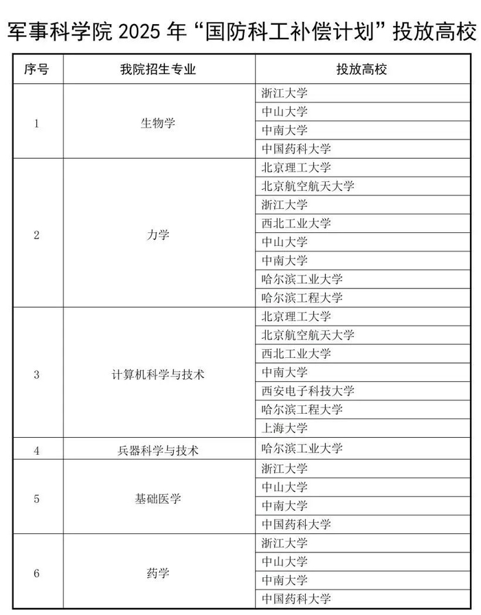 2025年我院接收补偿计划的学科专业为生物学、力学、计算机科学与技术、兵器科学与技术、基础医学、药学,涉及北京航空航天大学、北京理工大学、浙江大学、中山大学、中南大学、哈尔滨工业大学、西北工业大学、西安电子科技大学、哈尔滨工程大学、中国药科大学、上海大学11所高校。每个高校接收的学院、学科专业、指标数量均不相同,具体情况请考生联系所在高校获取。