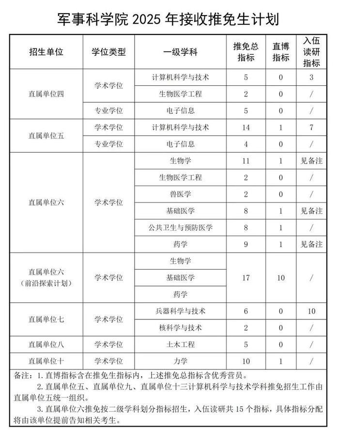 根据国家和军队有关要求,现就接收2025年优秀应届本科毕业生免试攻读研究生(以下简称“推免”,含入伍攻读硕士研究生)有关工作预通知如下: