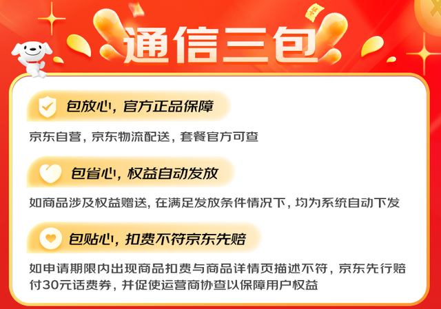 京东“通信三包”号卡旨在带给消费者放心、省心、贴心的体验。包放心,即号卡产品均为京东自营,官方正品保障,通过京东物流配送,套餐官方可查;包省心,即商品如果涉及权益赠送,在满足发放条件情况下,均为系统自动下发;包贴心,即申请期限内出现商品扣费与详情页描述不符,京东先行赔付30元话费券,全力维护和保障消费者权益。