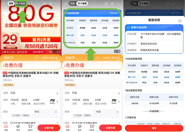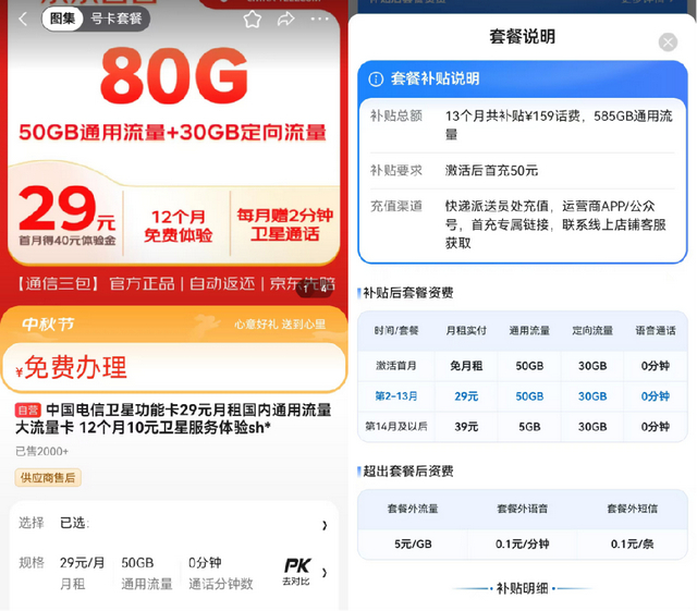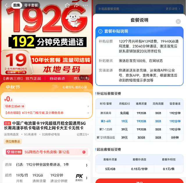 下面一起来看看有哪些超值卡号可供选择。中国移动花卡39档就是不错的选择之一,月费为39元,激活时参加首充50活动,送120元话费(次月起每月自动到账10元,连续赠12个月),相当于首年月费为29元。中国移动花卡39档每月包含5GB通用流量、30GB专属流量,首年还赠送每月45GB通用流量。消费者可在商详页点击“号卡套餐”,然后点击说明图片,就能查看套餐说明,了解具体资费和补贴。