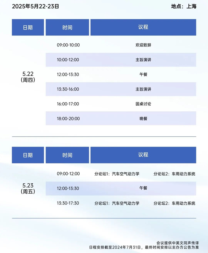第八届上海-斯图加特汽车及动力系统国际研讨会(SSS 2025)将于2025年5月22-23日在上海举行。在此次两天的会议日程中,主办方将邀请汽车及动力系统领域国内外知名专家学者进行演讲和展示最前沿的研究成果,呈现多场主旨及技术论坛。为了提高学术交流水平,SSS2025 展开论文摘要征集活动。被研讨会录用的论文作者,将于会议期间进行演讲或是海报展示。