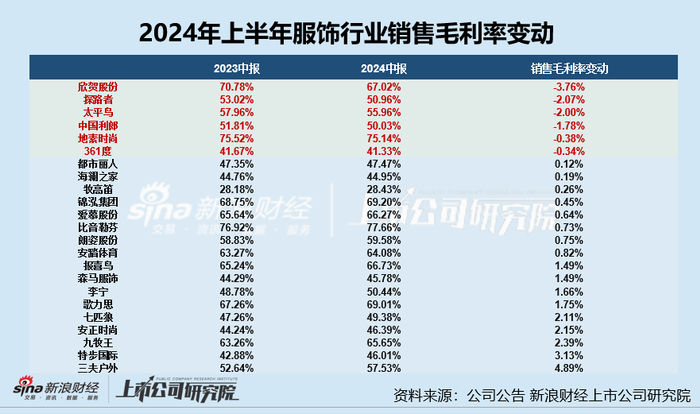 动态来看,2024年上半年欣贺股份、探路者、太平鸟、中国利郎、地素时尚、361度6家上市公司的销售毛利率出现了下滑,分别较去年同期下降3.76%、2.07%、2%、1.78%、0.38%、0.34%。