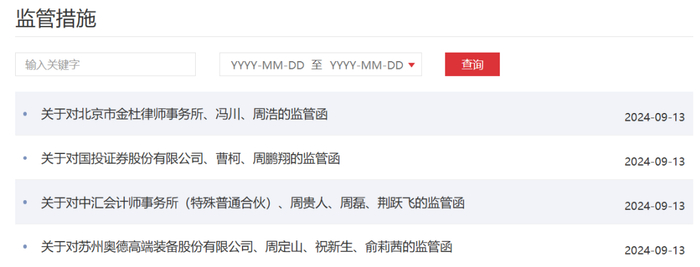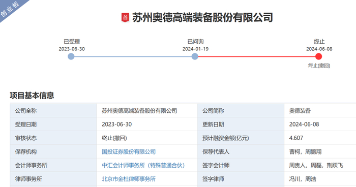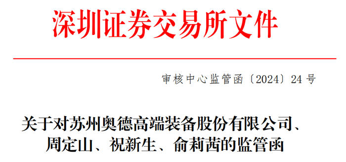 9月13日,深交所发布4份监管函,事关已撤回创业板IPO申请的苏州奥德高端装备股份有限公司,由于存在未完整披露报告期内与关联方及第三方进行的资金拆借;未充分披露内部控制缺陷、公司治理不规范的情形;部分会计处理不规范,相关信息披露不准确等违规问题,发行人奥德装备、保荐机构国投证券、律所北京金杜所、审计机构中汇所及相关人员均被深交所书面警示。