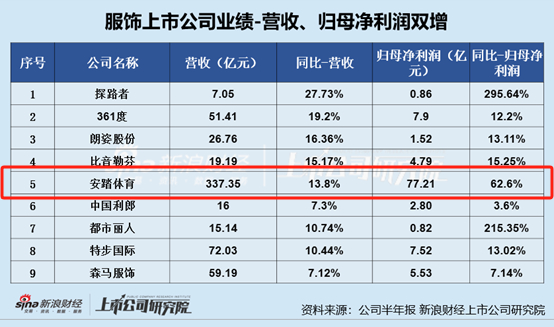 报告期内,仅有少数几家服饰服装上市公司实现了营收、净利润双增,其他企业则要么营收下滑、要么归母净利润下滑,业绩双增的上市公司中,就包含行业龙头安踏体育。2024年上半年,安踏体育共实现营收337.35亿元,同比增长13.8%;共实现归母净利润77.21亿元,同比增长62.6%。