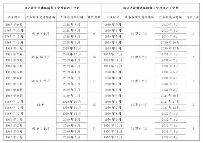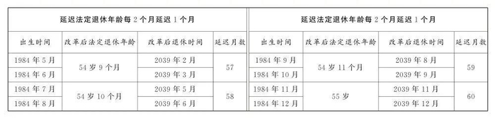 男职工和原法定退休年龄55周岁的女职工,每4个月延迟1个月;原法定退休年龄50周岁的女职工,每2个月延迟1个月。为了让公众更清楚看到自己未来什么时间退休,决定后附了延迟法定退休年龄对照表,可以根据自己的出生年月对照查询。