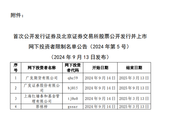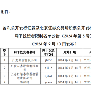 9月13日,中证协发布公告,为规范网下投资者及其配售对象的网下询价与申购行为,根据《首次公开发行证券网下投资者管理规则》(以下简称《管理规则》)的有关规定,决定对在网下询价和配售过程中发现的存在《管理规则》第四十一条规定禁止性情形的网下投资者列入限制名单(详见附件)。列入限制名单时限自本公告发布之次日(工作日)起计算。