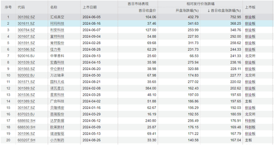 此外,珂玛科技等10只股票上市首日收盘价涨幅都超过200%。