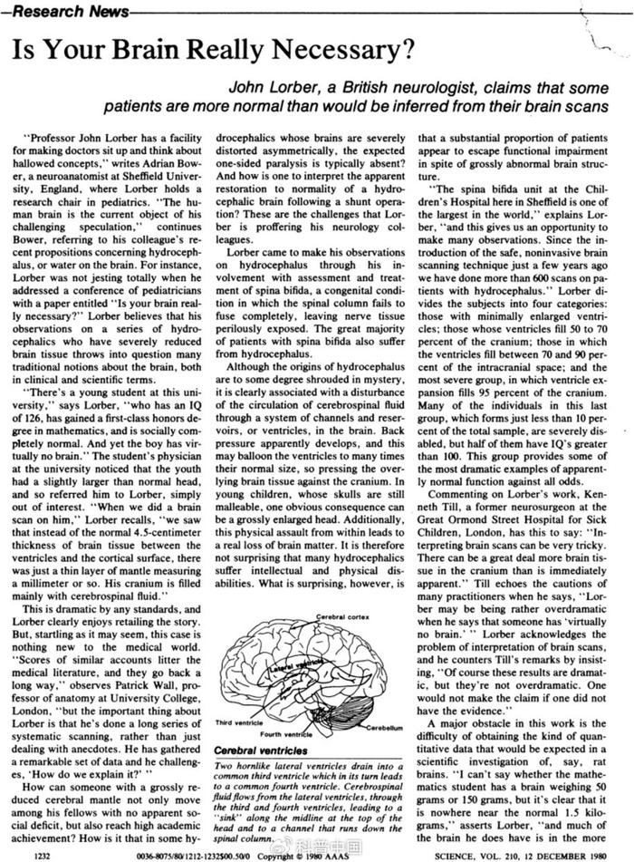 医生被采访的时候说,虽然很多疾病都能引发大脑萎缩,但也都伴随着各种心智能力的损失,从未听说过如此严重的脑积水却不影响大脑正常运行的。不过,这种情况其实有一些先例。四十多年前,类似的症状甚至引发过医学界的一波争吵。