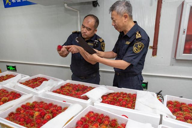 9月12日21时,一架来自泰国曼谷的航班载着1.42吨的金枕榴莲和2.47吨红毛丹运抵首都国际机场。航班起飞前,进口商就上传了相关电子文件,提前申报报关手续,首都机场海关查验处关员王航和王鹏宇因此早已等候查验区。“热带水果不耐存储,宁愿人等货,不能货等人。”王航说。