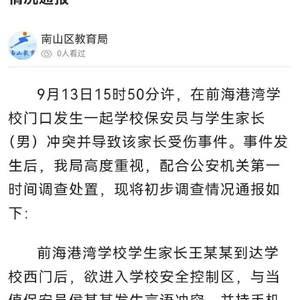 前海港湾学校学生家长王某某到达学校西门后,欲进入学校安全控制区,与当值保安员侯某某发生言语冲突,并持手机拍摄侯某某,侯某某情绪失控,持叉杆击打王某某,导致王某某头部、手部受伤。随后,王某某送医救治,侯某某被公安机关控制。目前,王某某伤情稳定,侯某某已被公安机关依法刑事拘留。