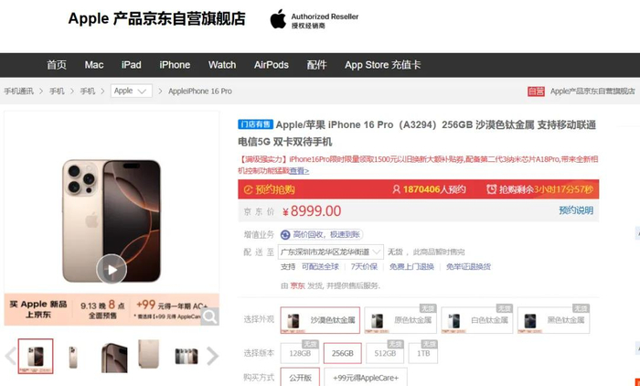 记者注意到,在天猫苹果官方旗舰店,iPhone 16和iPhone 16 Plus货源充足;iPhone 16 Pro和iPhone 16 Pro Max最为抢手!特别是沙漠金版本,首批货源开售即秒罄,天猫连夜追加补货,1小时内多达15次。
