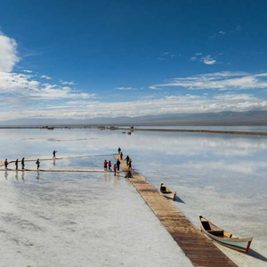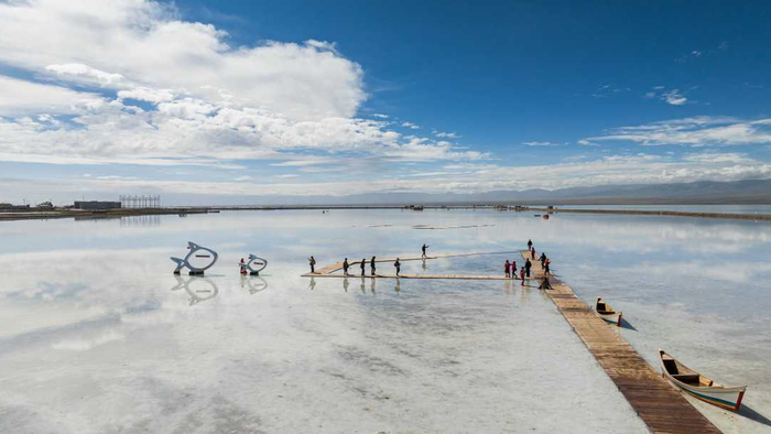 9月13日,游客在青海省海西蒙古族藏族自治州乌兰县的茶卡盐湖游览。进入秋季,茶卡盐湖的湖水逐渐纯净,盐层开始结晶,平静的湖面如同天然镜面,倒映着湛蓝天空与远处的皑皑雪山,水天一色。