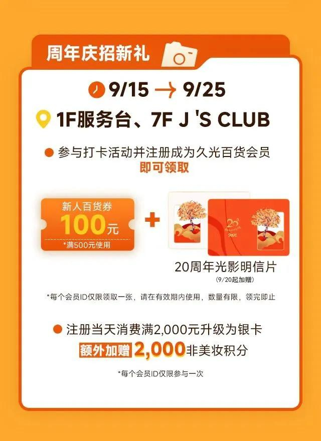 参与打卡活动并注册成为久光百货会员即可领取100元新人百货券(满500元使用)及20周年庆专属明信片。