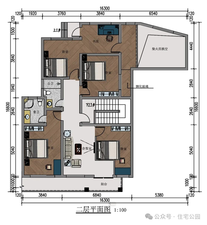 4间卧室与双卫生间的设计,功能性更强。柴火房上空做了挑空处理,视觉效果更为出色。