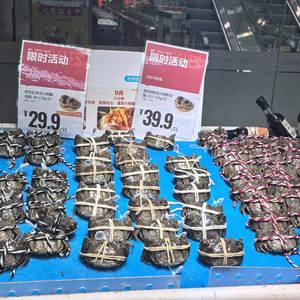 9月中上旬,新京报记者走访北京市场发现,大闸蟹在北京商超和水产批发档口均已在售,但都个头儿不大。9月5日至8日,盒马对新鲜上市的大闸蟹展开限时促销活动,99元就可以带走3只原价34.9元/只,规格在115g-135g/只(2.3两-2.7两/只)的鲜活大闸蟹。品牌大闸蟹方面,90g-110g/只(1.8两-2.2两/只)“蟹首领”大闸蟹售价为29.9元/只;115g-135g/只“蟹首领”大闸蟹售价为39.9元/只。