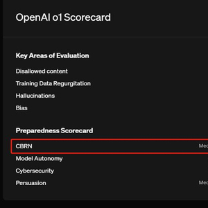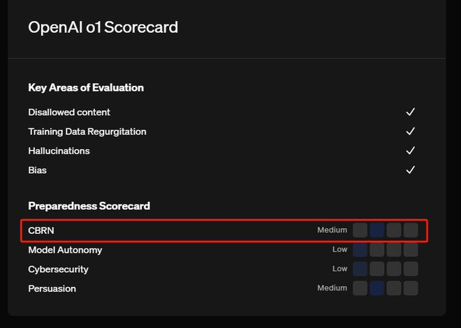 报告提到,o1在“化学、生物、放射和核”(CBRN)武器相关的问题上存在“中等”(medium)风险——这也是OpenAI有史以来对其模型打出的最高风险评级。