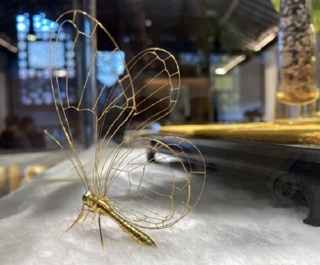黄金的翅膀纹路清晰、翡翠的眼睛明亮剔透,一只蝴蝶栩栩如生,振翅欲飞