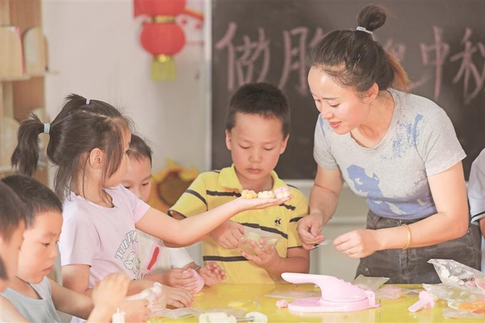 中秋将至,毕节市黔西市文峰街道惠风中心幼儿园的老师带领小朋友们一起做月饼、吃月饼,感受传统文化,喜迎中秋节。图为9月14日,幼儿园的老师和小朋友们在做月饼。