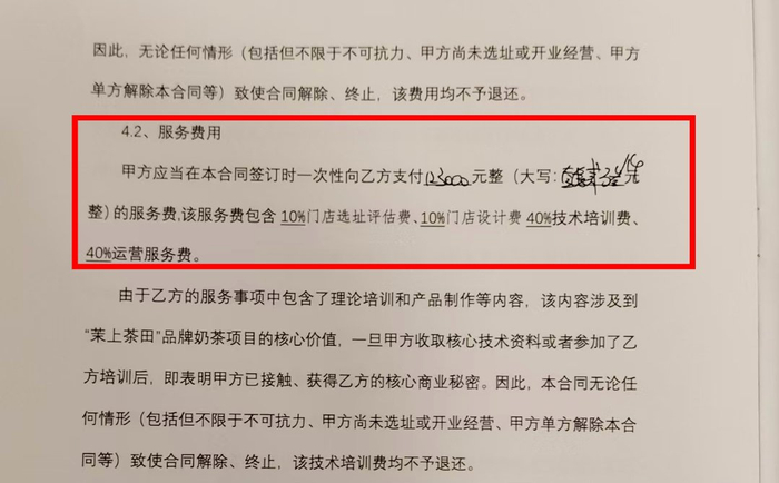 而支付的17.3万元加盟费中,12.3万元用于支付给茉上茶田作为服务费用,该服务费包含10%门店选址评估费、10%门店设计费、40%技术培训费及40%运营服务费。