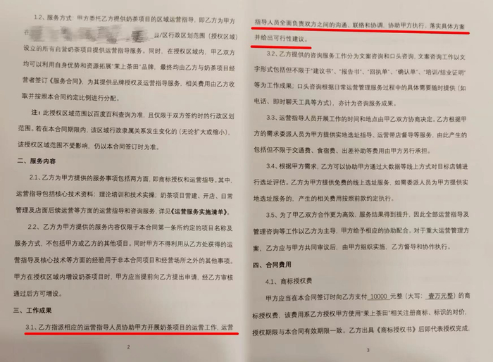 张先生提供的《服务合同书》显示,茉上茶田(北京)餐饮管理有限公司应指派相应的运营指导人员,协助甲方(加盟商)开展奶茶项目的运营工作。运营指导人员全面负责双方之间的沟通、联络和协调,协助甲方执行、落实具体方案并给出可行性建议。