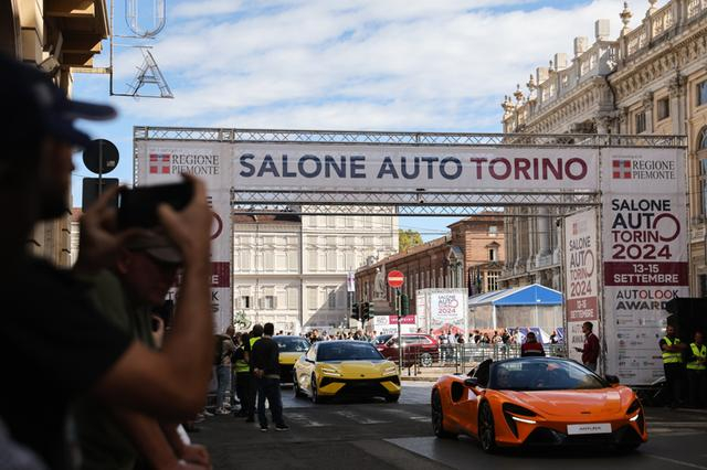 9月13日,在意大利都灵圣卡洛广场,参加车展的车辆经过市中心罗马街。2024年都灵车展13日在意大利北部城市都灵开幕。本届车展设在都灵市中心多个商业街和广场上。