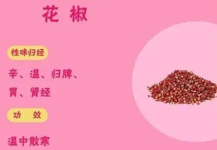 归脾、胃、肾经,有温中散寒的作用,可以散肺寒、温肾阳、温补脾胃。花椒不仅能内服,还可外用热敷。
