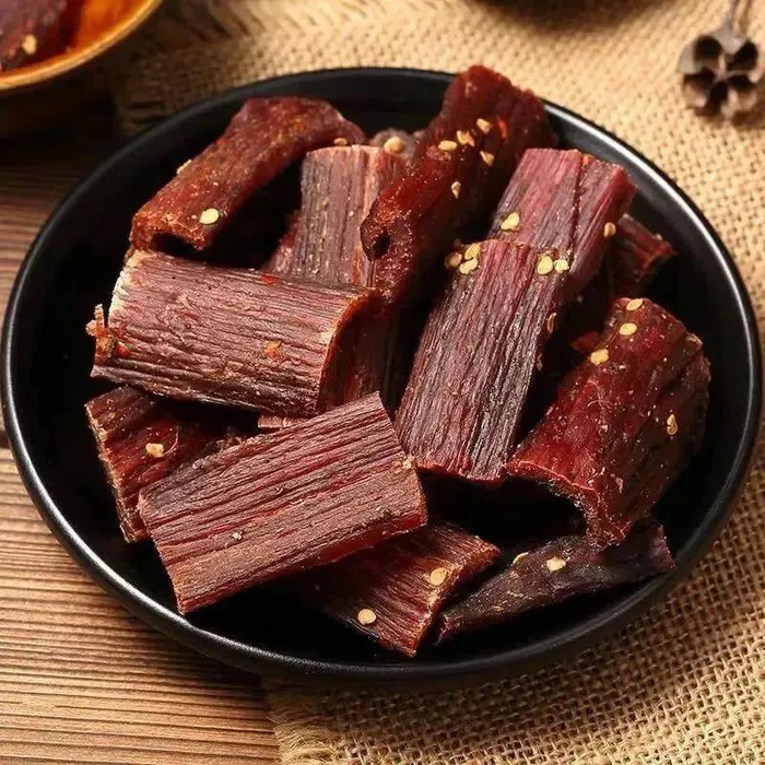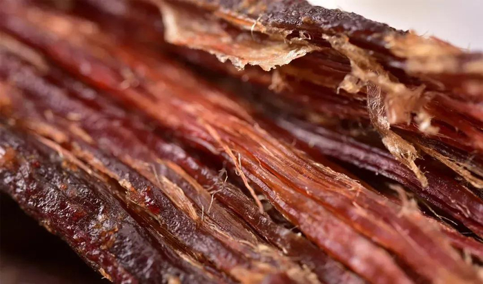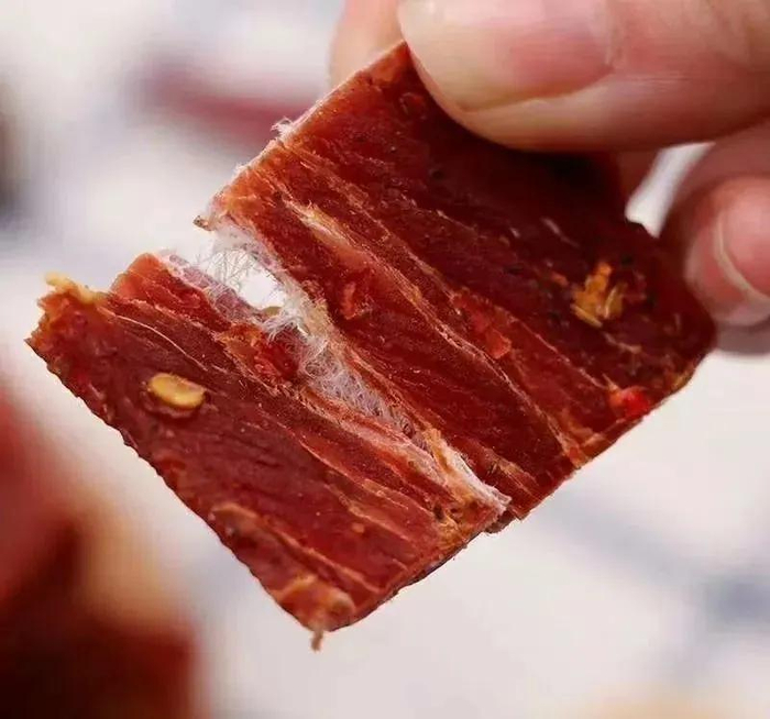 越嚼越香:牛肉晒致八成干,用手一根根的撕下来,肉质干而不柴,慢慢咀嚼,鲜香筋道。