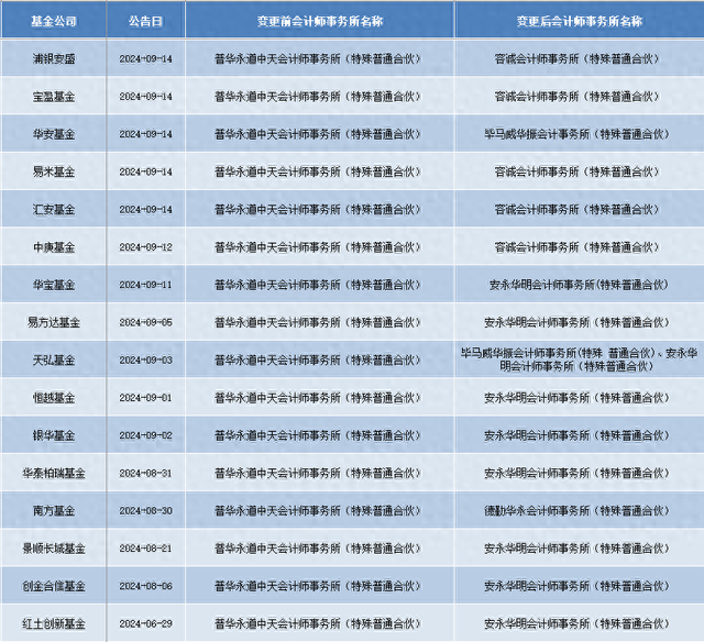 具体而言,9月以来,除了上述5家基金公司,普华永道还被中庚基金、华宝基金、易方达基金、天弘基金、恒越基金、银华基金等改聘。