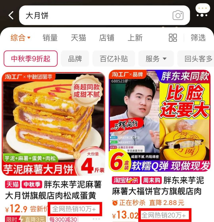 淘工厂上,芋泥麻薯大月饼正在热销,官方甚至为大月饼、蛋黄月饼、胖东来这几大关键词添加了搜索引导,观察发现,不少链接显示已售出超20万件、甚至40万件,谁能想到今秋火的第一个食品竟然是大月饼。