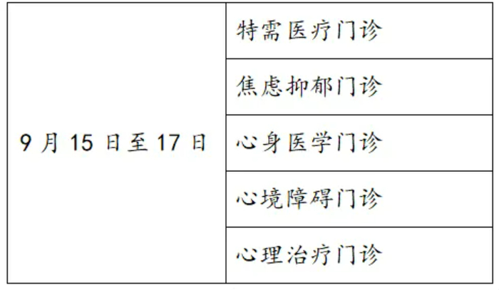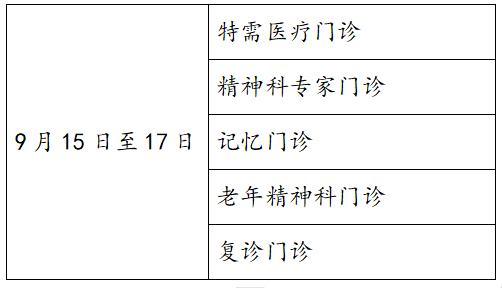 内科中心门诊:9月15日-17日全天开放;