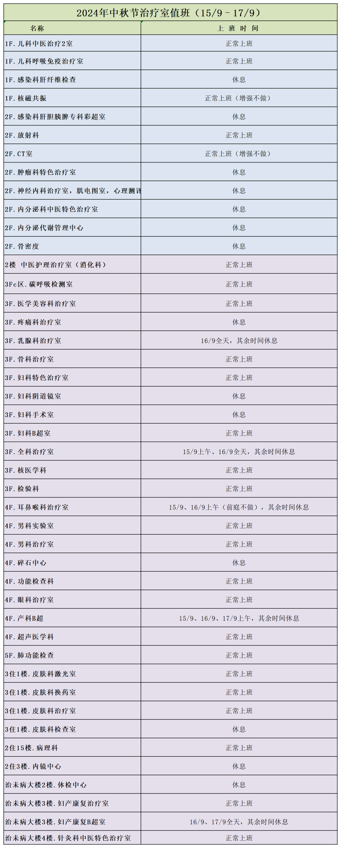 4.超声科:9月15日-17日可做普通项目;产科项目及胃部超声可预约节后检查。