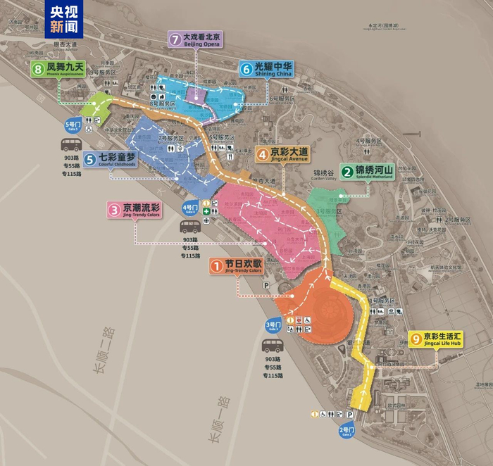 - 随后游客可以沿着京彩大道“一左一右”地游览,将京彩大道主干线及两侧各大主题区尽收眼底。